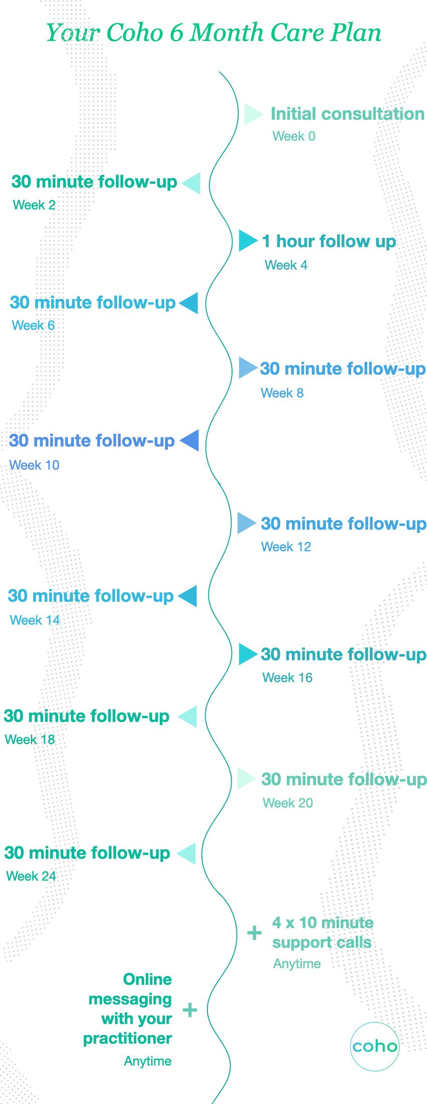 The Coho 6 month care plan is ideal if you have more complex chronic health challenges that have been present for a number of years and / or that involve multiple conditions or diagnoses.